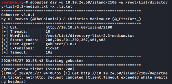 New directory was found. (http://10.10.24.60/island/2100/). There is hint (.ticket). This hint for us to do another dir enumeration for extension .ticket. This time i gonna use gobuster. Gobuster make it easy for me to specify the extension that i need.