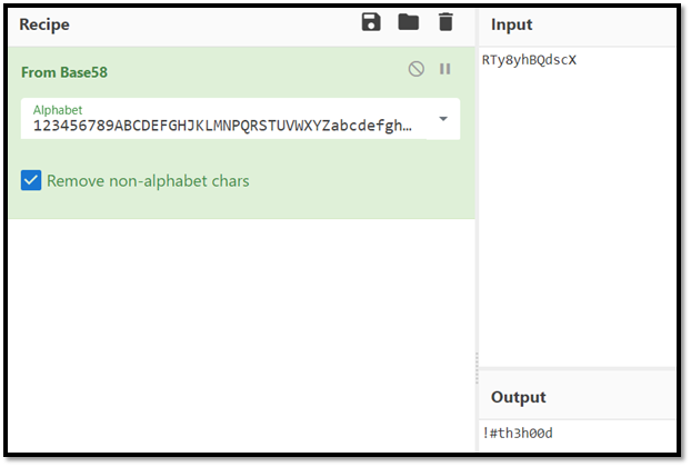 We are given a token RTy8yhBQdscX. Seems like this token was encrypt by something. Fire up CyberChef to decrypt our token. After trying, I found that, it was encrypt by Base58.